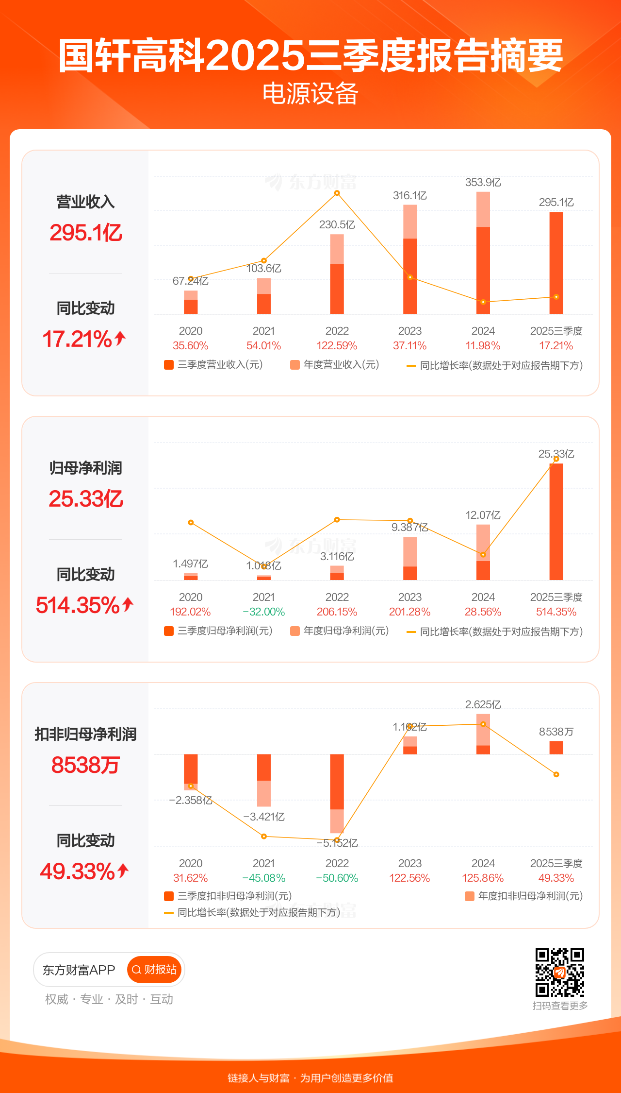 国轩高科10月25日发布2025年三季报显示,公司前三季实现营业收入295.08亿元,同比增长17.21%;归母净利润25.33亿元,同比增长514.35%;扣非归母净利润8537.77万元,同比增长49.33%。