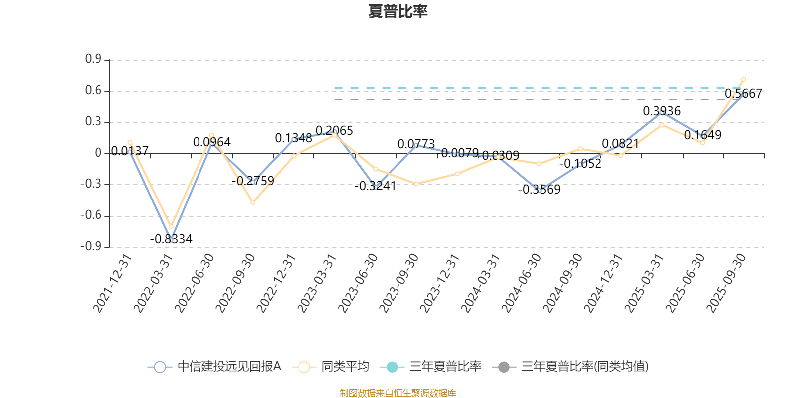 截至9月30日,基金近三年夏普比率为0.6308,位于同类可比基金184/518。