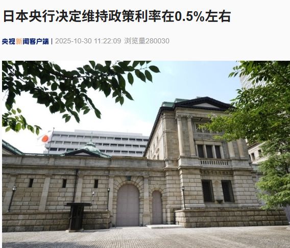另据央视新闻,日本央行在10月30日召开的货币政策会议上决定,维持当前0.5%左右的政策利率不变。