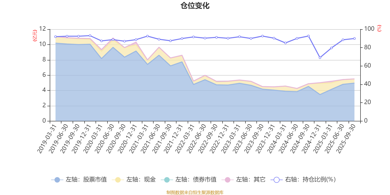 据定期报告数据统计,近三年平均股票仓位为87.48%,同类平均为85.99%。2019年末基金达到93.03%的最高仓位,2024年末最低,为69.04%。