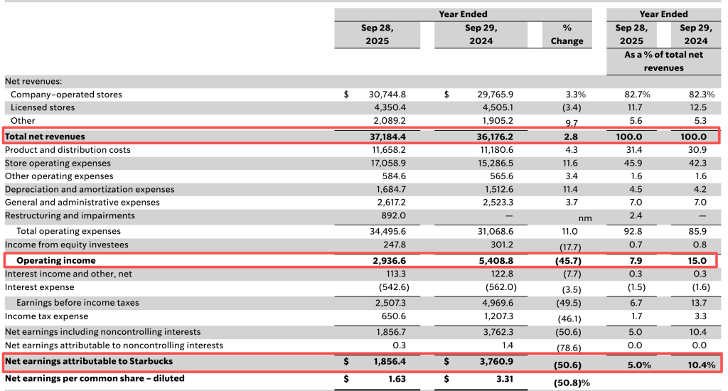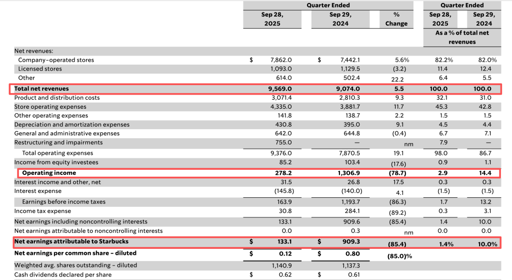 10月30日,全球连锁咖啡星巴克(Nasdaq:SBUX)发布截至2025年9月28日的2025财年第四财季及全财年业绩报告。2025财年第四财季总净收入为95.69亿美元,同比增长5.5%,高于市场预期;实现营业利润2.78亿美元,同比下滑78.7%;实现归母净利润为1.33亿美元,同比下滑85.4%;每股收益调整后为52美分,低于市场预期。