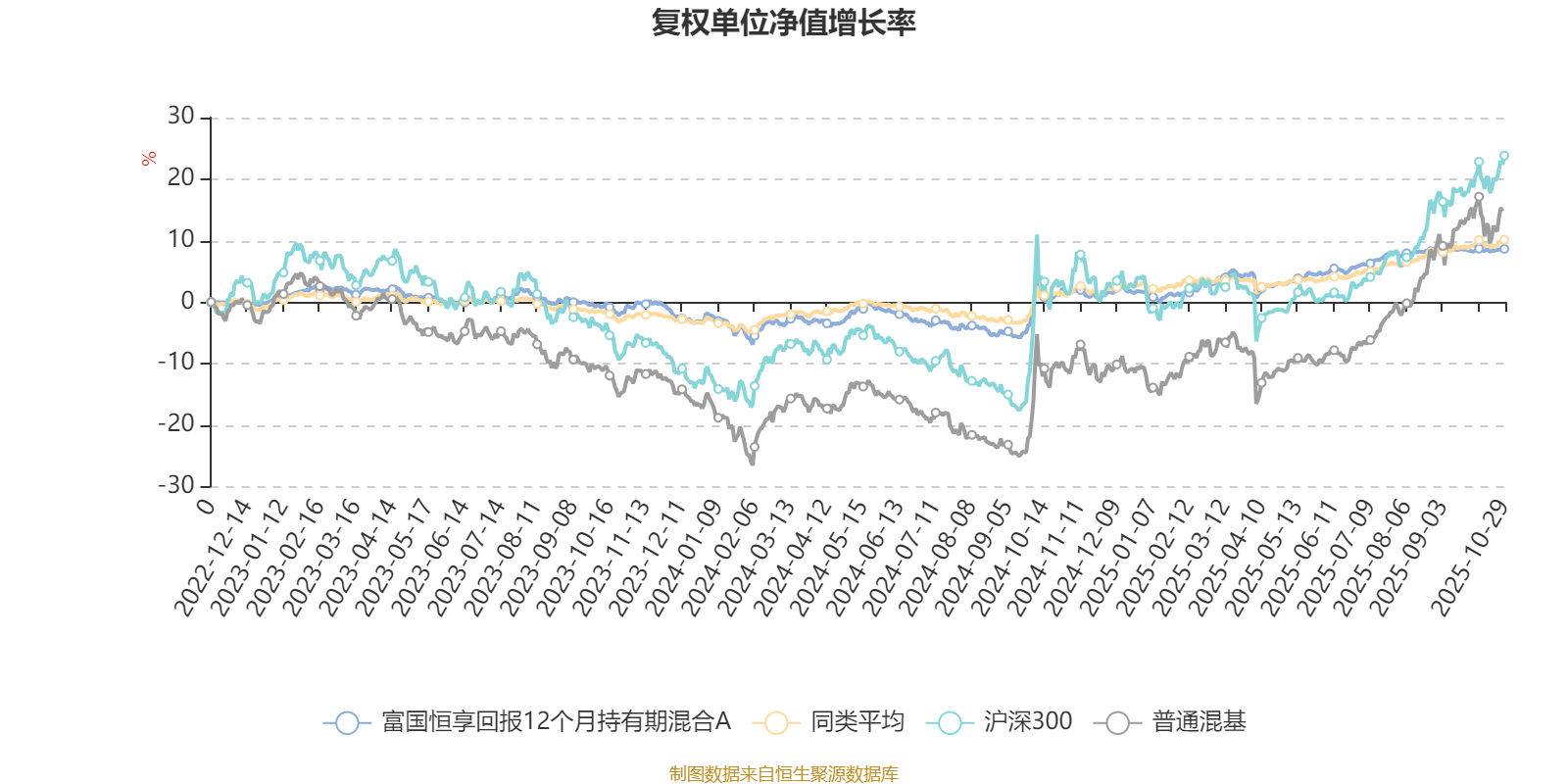 截至10月29日,富国恒享回报12个月持有期混合A近三个月复权单位净值增长率为0.56%,位于同类可比基金568/629;近半年复权单位净值增长率为5.54%,位于同类可比基金319/629;近一年复权单位净值增长率为6.71%,位于同类可比基金375/623。