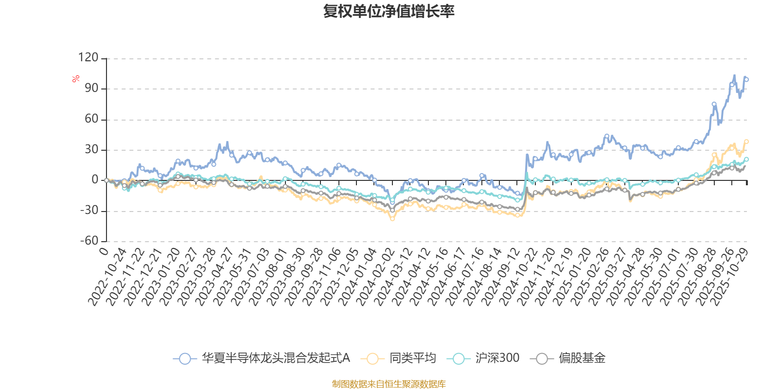 截至10月29日,华夏半导体龙头混合发起式A近三个月复权单位净值增长率为42.39%,位于同类可比基金75/229;近半年复权单位净值增长率为49.03%,位于同类可比基金122/229;近一年复权单位净值增长率为65.29%,位于同类可比基金80/213;近三年复权单位净值增长率为101.43%,位于同类可比基金18/158。