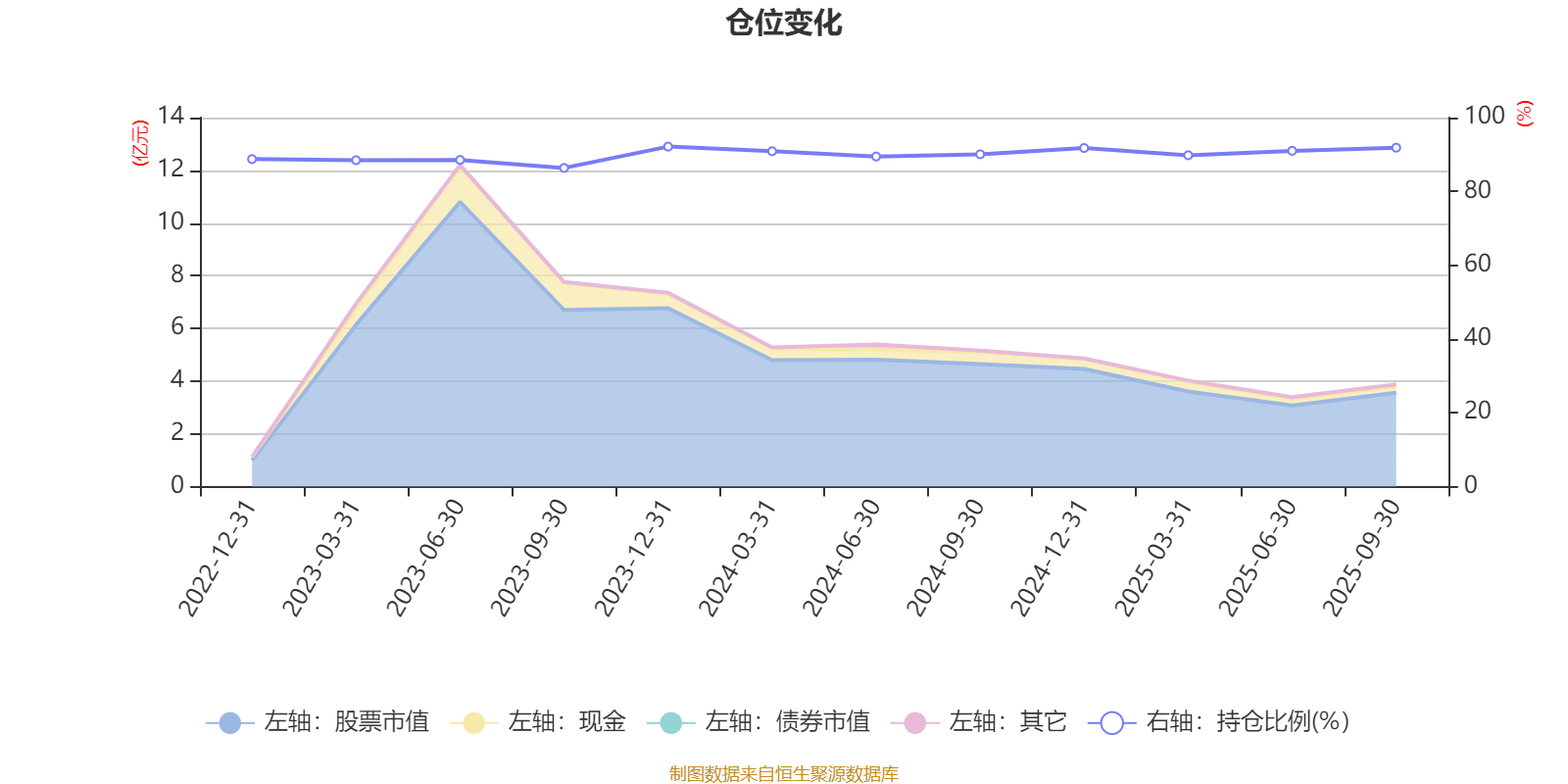 据定期报告数据统计,近三年平均股票仓位为89.92%,同类平均为86.77%。2023年末基金达到92.14%的最高仓位,2023年三季度末最低,为86.35%。