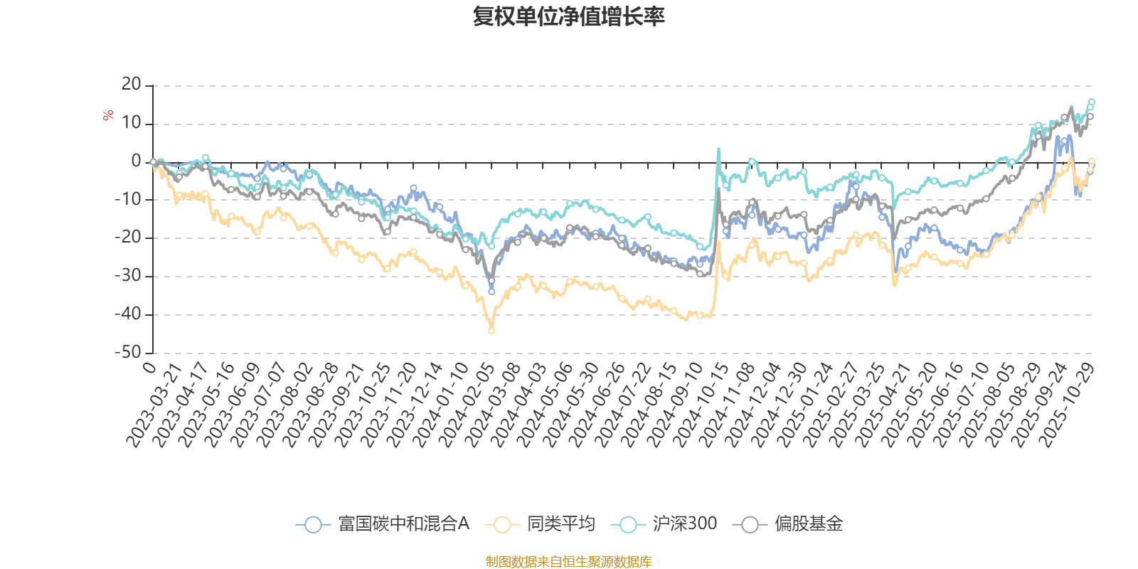 截至10月29日,富国碳中和混合A近三个月复权单位净值增长率为22.15%,位于同类可比基金52/100;近半年复权单位净值增长率为24.95%,位于同类可比基金74/99;近一年复权单位净值增长率为18.09%,位于同类可比基金73/90。