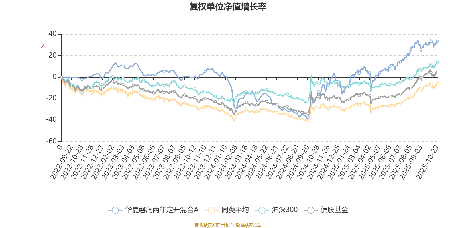 截至10月29日,华夏磐润两年定开混合A近三个月复权单位净值增长率为9.34%,位于同类可比基金448/621;近半年复权单位净值增长率为32.42%,位于同类可比基金272/621;近一年复权单位净值增长率为58.44%,位于同类可比基金75/611;近三年复权单位净值增长率为36.44%,位于同类可比基金140/518。