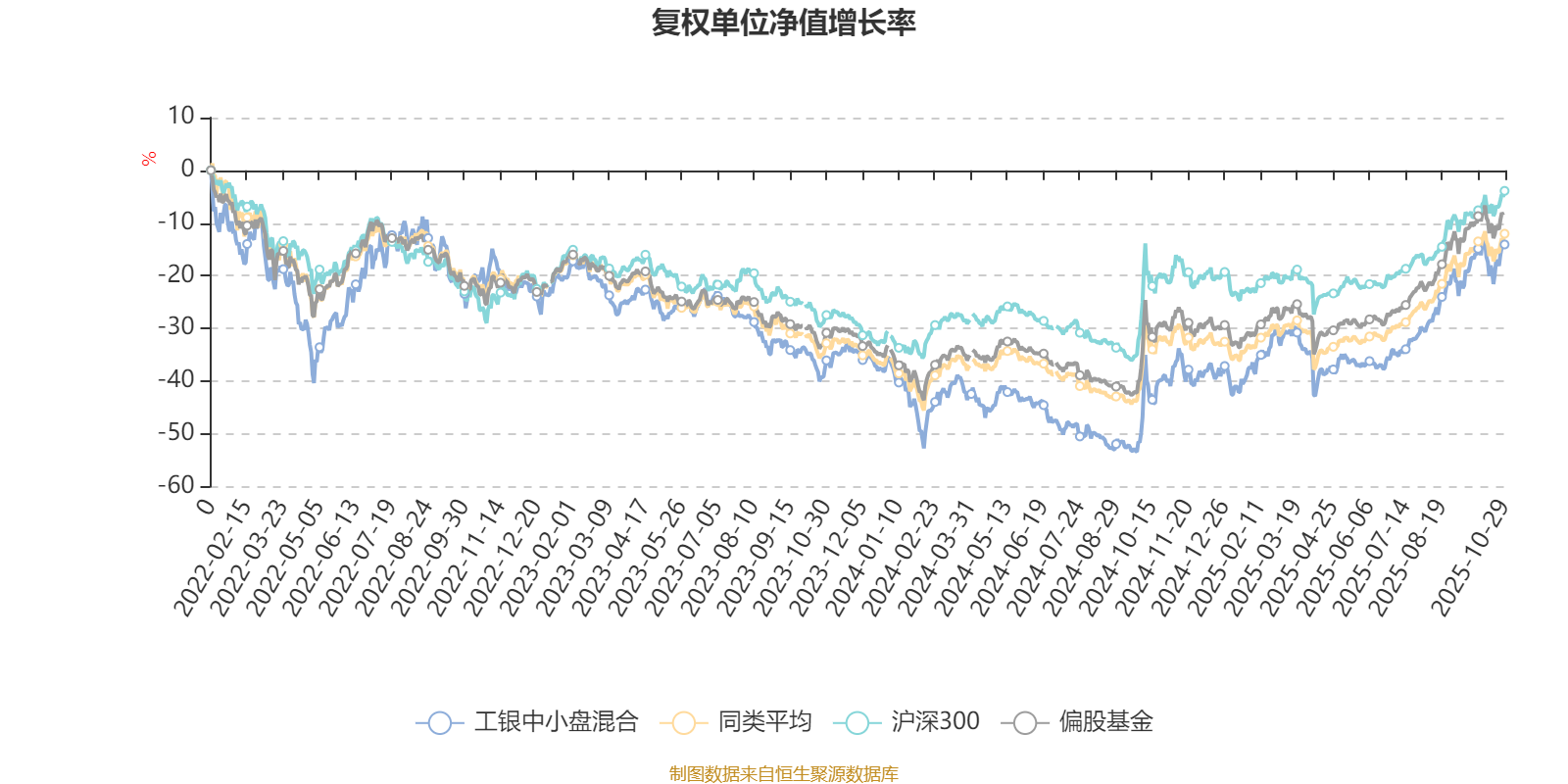截至10月29日,工银中小盘混合近三个月复权单位净值增长率为22.22%,位于同类可比基金45/185;近半年复权单位净值增长率为39.17%,位于同类可比基金55/185;近一年复权单位净值增长率为42.58%,位于同类可比基金48/181;近三年复权单位净值增长率为12.00%,位于同类可比基金127/175。