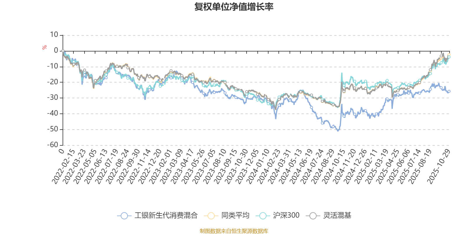 截至10月29日,工银新生代消费混合近三个月复权单位净值增长率为-0.83%,位于同类可比基金1231/1287;近半年复权单位净值增长率为4.15%,位于同类可比基金1178/1287;近一年复权单位净值增长率为21.88%,位于同类可比基金696/1287;近三年复权单位净值增长率为7.36%,位于同类可比基金880/1286。