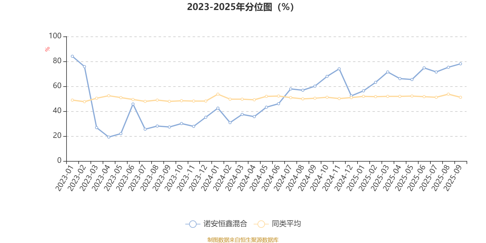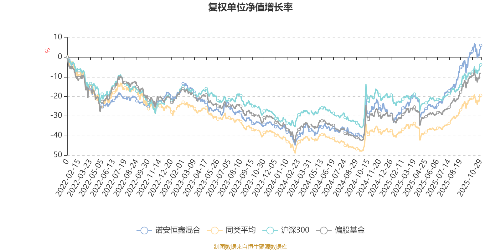 截至10月29日,诺安恒鑫混合近三个月复权单位净值增长率为23.13%,位于同类可比基金149/689;近半年复权单位净值增长率为44.91%,位于同类可比基金124/688;近一年复权单位净值增长率为44.25%,位于同类可比基金138/657;近三年复权单位净值增长率为42.05%,位于同类可比基金61/364。