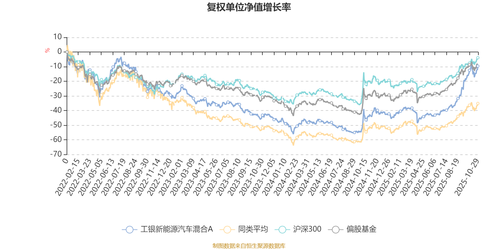 截至10月29日,工银新能源汽车混合A近三个月复权单位净值增长率为41.12%,位于同类可比基金8/100;近半年复权单位净值增长率为63.34%,位于同类可比基金3/99;近一年复权单位净值增长率为59.69%,位于同类可比基金11/90;近三年复权单位净值增长率为28.61%,位于同类可比基金9/62。