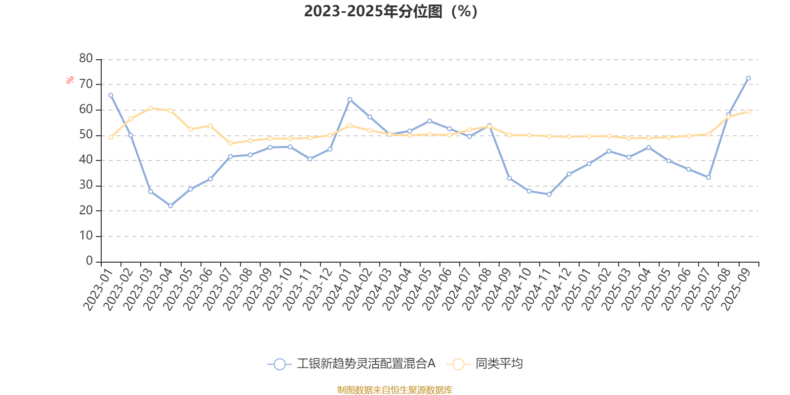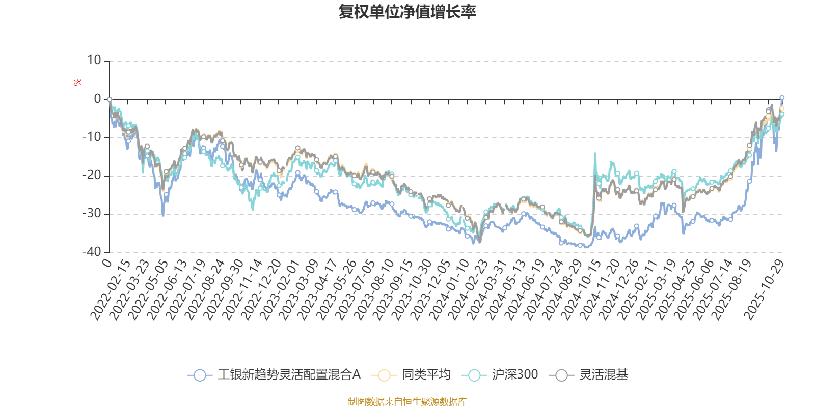 截至10月29日,工银新趋势灵活配置混合A近三个月复权单位净值增长率为38.91%,位于同类可比基金89/1287;近半年复权单位净值增长率为46.90%,位于同类可比基金205/1287;近一年复权单位净值增长率为55.48%,位于同类可比基金134/1287;近三年复权单位净值增长率为31.53%,位于同类可比基金373/1286。