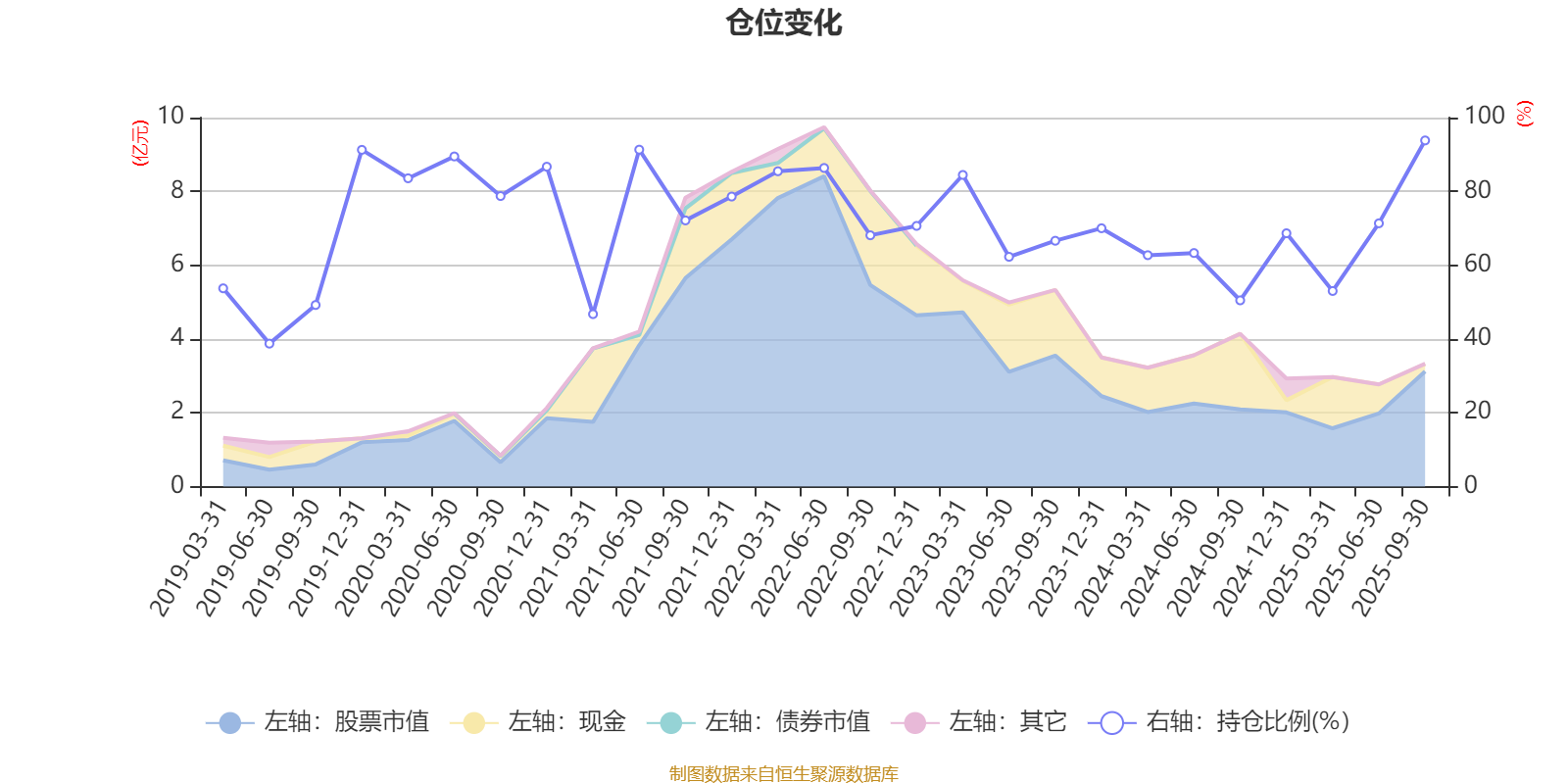 据定期报告数据统计,近三年平均股票仓位为68.11%,同类平均为72.35%。2025年三季度末基金达到93.81%的最高仓位,2019年上半年末最低,为38.74%。