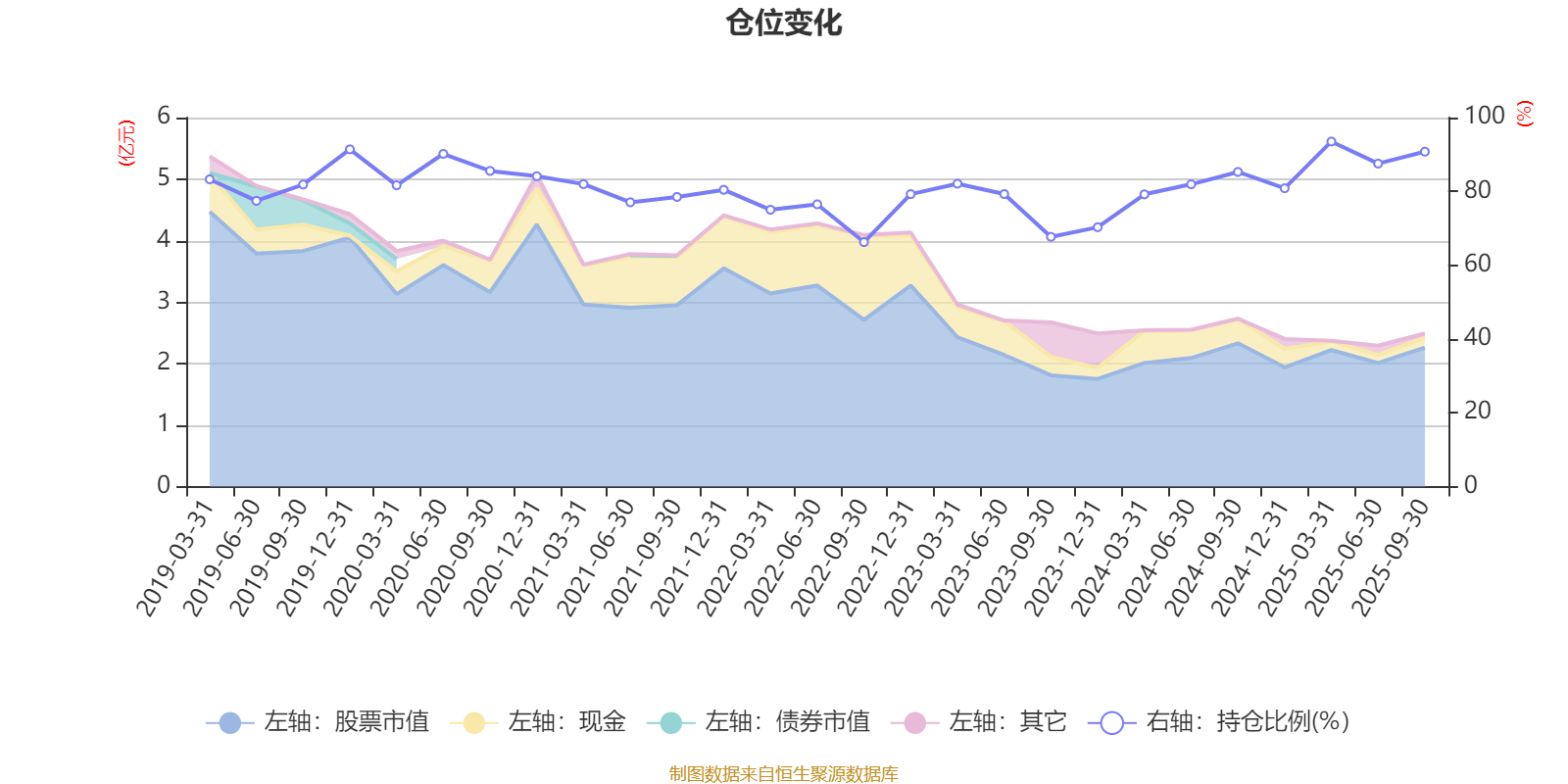 据定期报告数据统计,近三年平均股票仓位为81.47%,同类平均为85.66%。2025年一季度末基金达到93.51%的最高仓位,2022年三季度末最低,为66.26%。