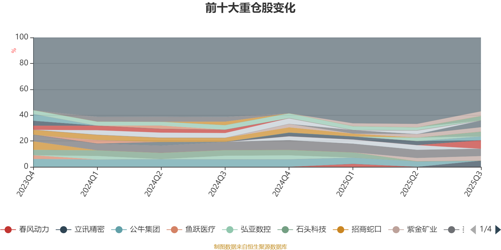 截至2025年三季度末,基金十大重仓股分别是宁德时代、美的集团、源杰科技、立讯精密、药明康德、三环集团、紫金矿业、金风科技、华鲁恒升、顺丰控股。
