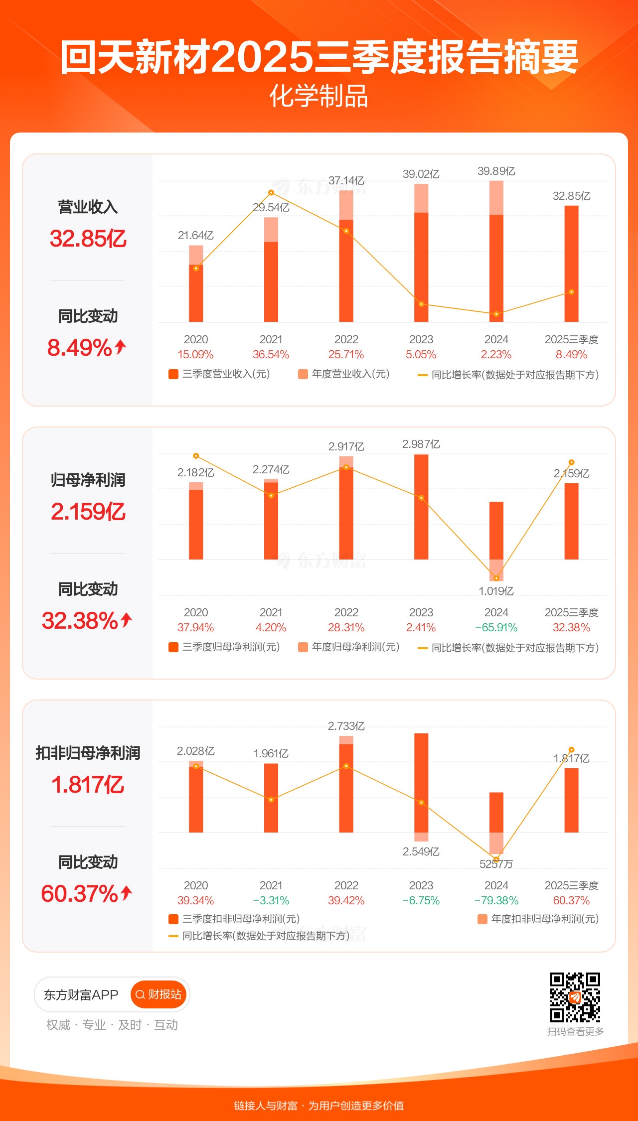 回天新材10月28日发布2025年三季报显示,公司前三季实现营业收入32.85亿元,同比增长8.49%;归母净利润2.16亿元,同比增长32.38%;扣非归母净利润1.82亿元,同比增长60.37%。