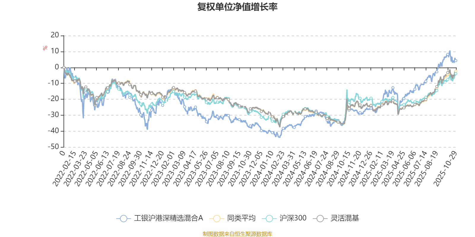 截至10月29日,工银沪港深精选混合A近三个月复权单位净值增长率为9.69%,位于同类可比基金748/1287;近半年复权单位净值增长率为27.49%,位于同类可比基金577/1287;近一年复权单位净值增长率为42.34%,位于同类可比基金263/1287;近三年复权单位净值增长率为68.54%,位于同类可比基金80/1286。