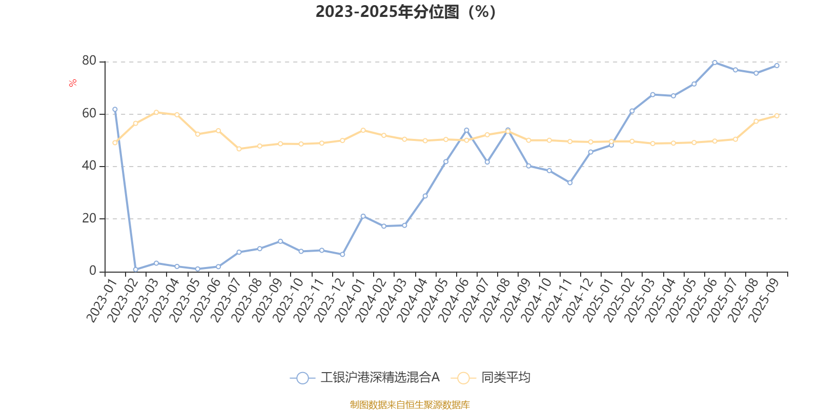 通过所选区间该基金净值增长率分位图,可以观察该基金与同类基金业绩比较情况。图为坐标原点到区间内某时点的净值增长率在同类基金中的分位数。