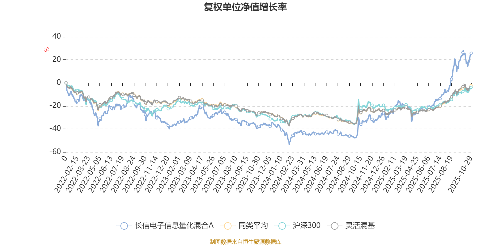 截至10月29日,长信电子信息量化混合A近三个月复权单位净值增长率为32.88%,位于同类可比基金149/1287;近半年复权单位净值增长率为70.56%,位于同类可比基金78/1287;近一年复权单位净值增长率为88.30%,位于同类可比基金32/1287;近三年复权单位净值增长率为74.15%,位于同类可比基金67/1286。