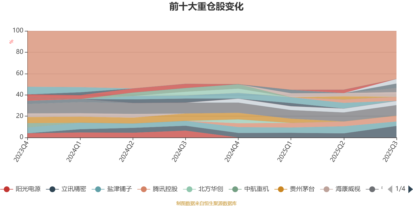 截至2025年三季度末,基金十大重仓股分别是立讯精密、宁德时代、腾讯控股、胜宏科技、三花智控、盐津铺子、阿里巴巴-W、寒武纪、拓普集团、海光信息。