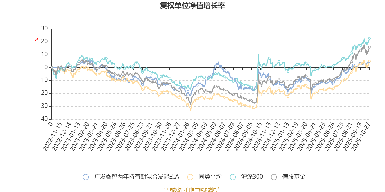 截至10月27日,广发睿智两年持有期混合发起式A近三个月复权单位净值增长率为7.96%,位于同类可比基金508/689;近半年复权单位净值增长率为20.69%,位于同类可比基金472/688;近一年复权单位净值增长率为10.78%,位于同类可比基金567/653;近三年复权单位净值增长率为4.65%,位于同类可比基金232/364。