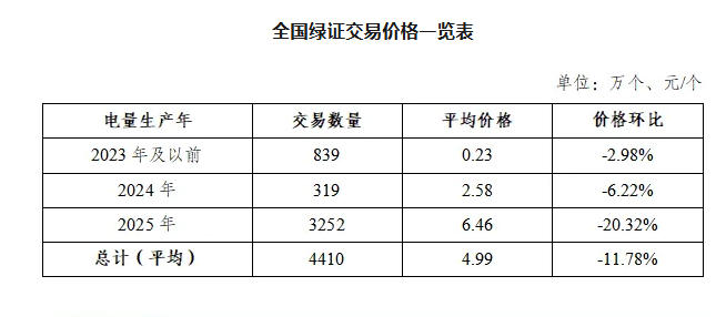 2025年9月,全国单独交易绿证4410万个,交易平均价格为4.99元/个,环比下降11.78%。