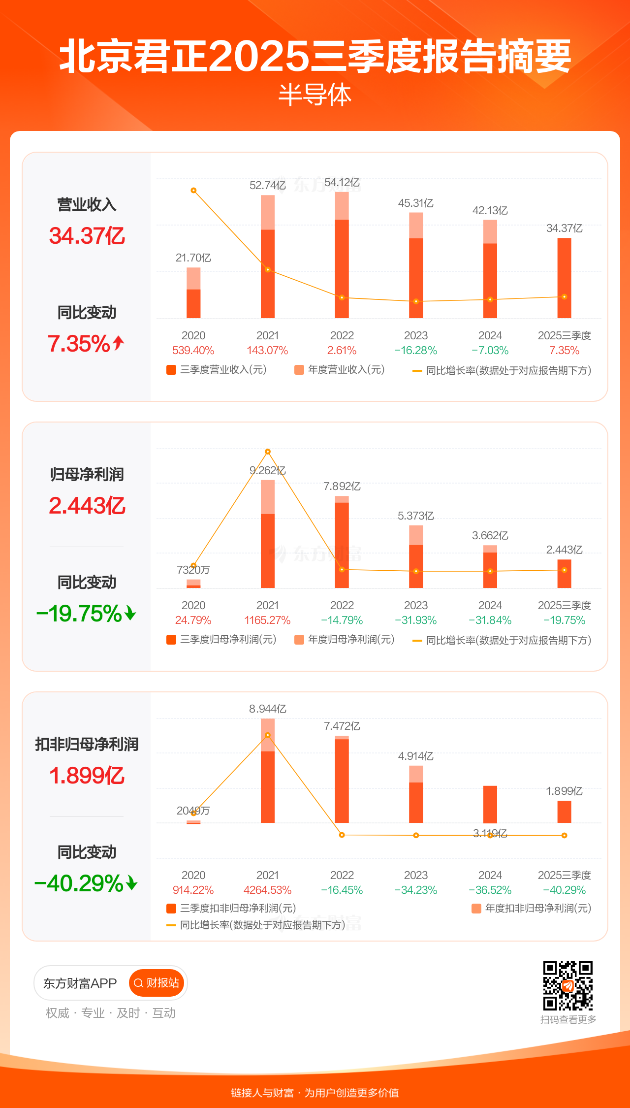 北京君正10月28日发布2025年三季报显示,公司前三季实现营业收入34.37亿元,同比增长7.35%;归母净利润2.44亿元,同比下滑19.75%;扣非归母净利润1.90亿元,同比下滑40.29%。