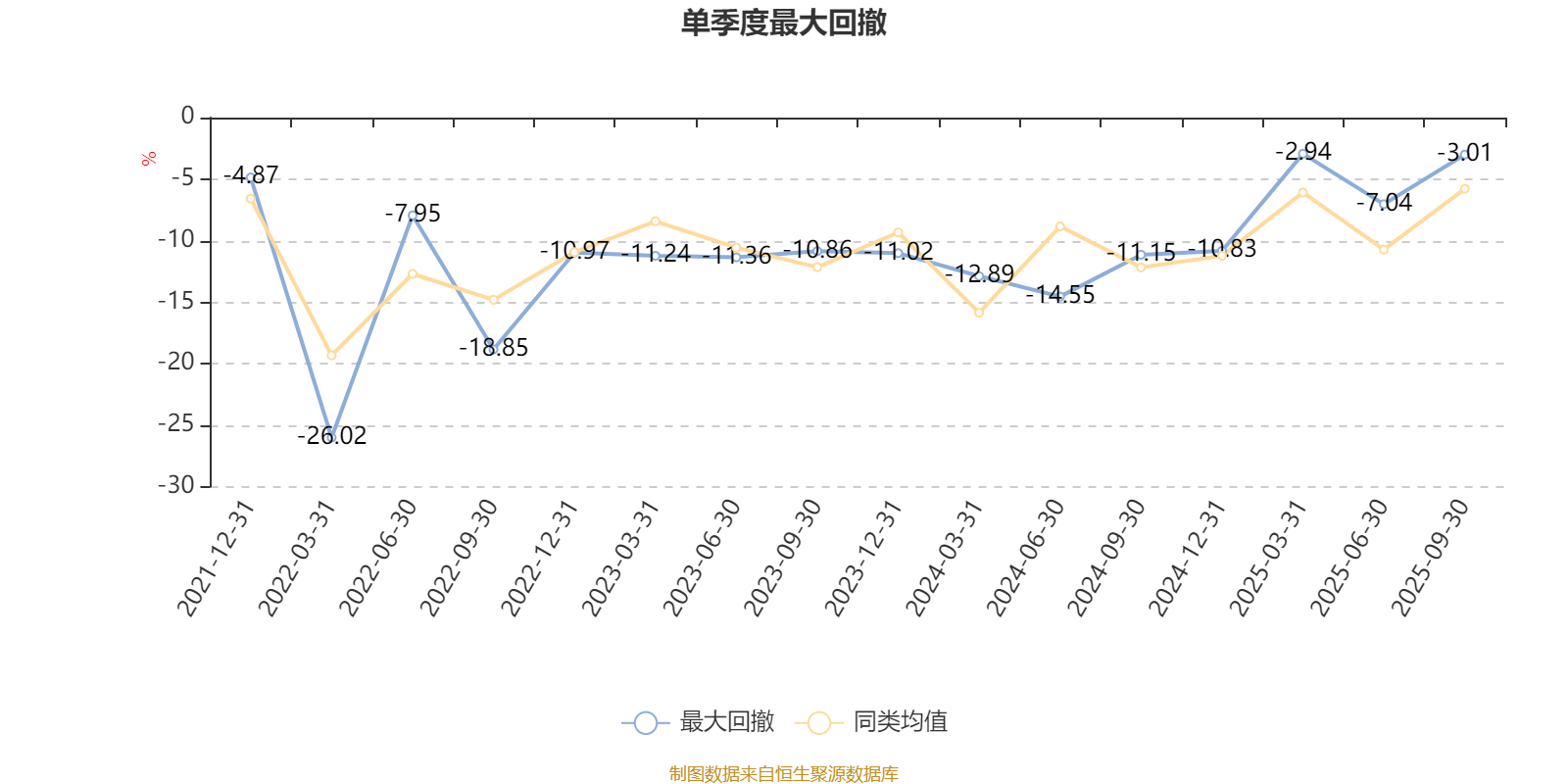 截至10月29日,基金近三年最大回撤为44.85%,同类可比基金排名291/363。单季度最大回撤出现在2022年一季度,为26.02%。