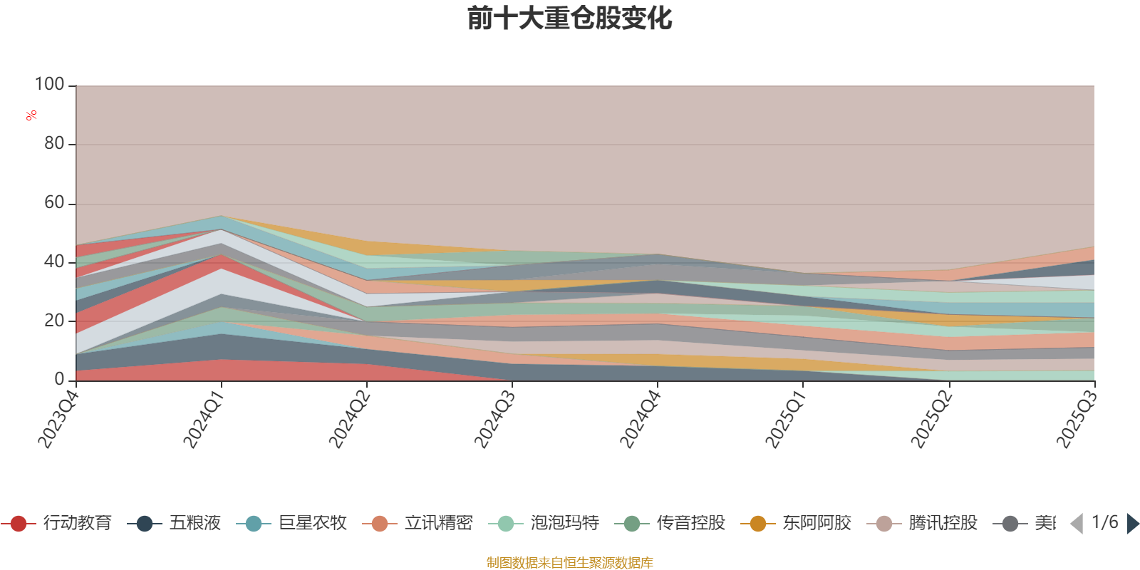 截至2025年三季度末,基金十大重仓股分别是拓普集团、伊利股份、宇通客车、阿里巴巴-W、福耀玻璃、东鹏饮料、赛力斯、腾讯控股、美的集团、泡泡玛特。
