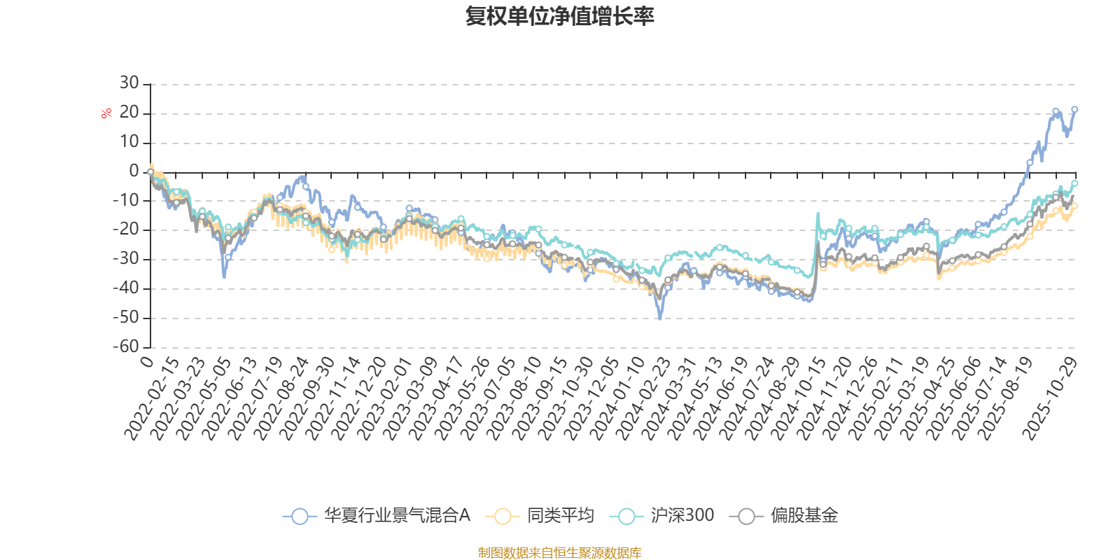 截至10月29日,华夏行业景气混合A近三个月复权单位净值增长率为32.10%,位于同类可比基金3/20;近半年复权单位净值增长率为59.66%,位于同类可比基金4/20;近一年复权单位净值增长率为63.23%,位于同类可比基金4/20;近三年复权单位净值增长率为45.72%,位于同类可比基金6/19。