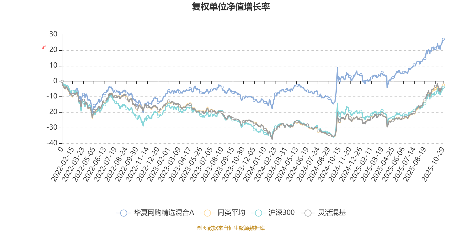 截至10月29日,华夏网购精选混合A近三个月复权单位净值增长率为12.56%,位于同类可比基金631/1287;近半年复权单位净值增长率为24.32%,位于同类可比基金658/1287;近一年复权单位净值增长率为24.41%,位于同类可比基金626/1287;近三年复权单位净值增长率为58.43%,位于同类可比基金115/1286。