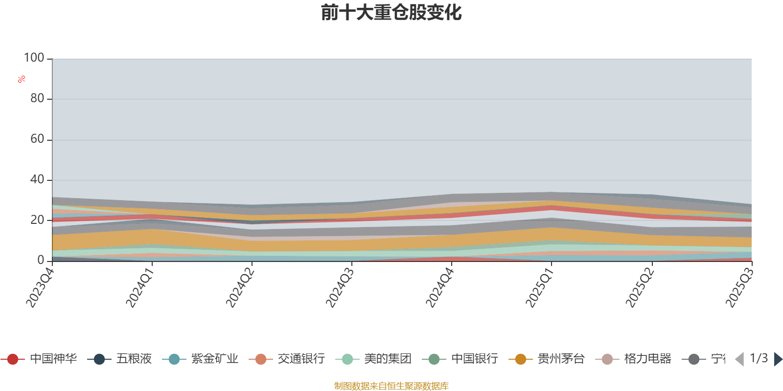 截至2025年三季度末,基金十大重仓股分别是宁德时代、贵州茅台、中国平安、紫金矿业、美的集团、招商银行、恒瑞医药、京东方A、农业银行、中国神华。