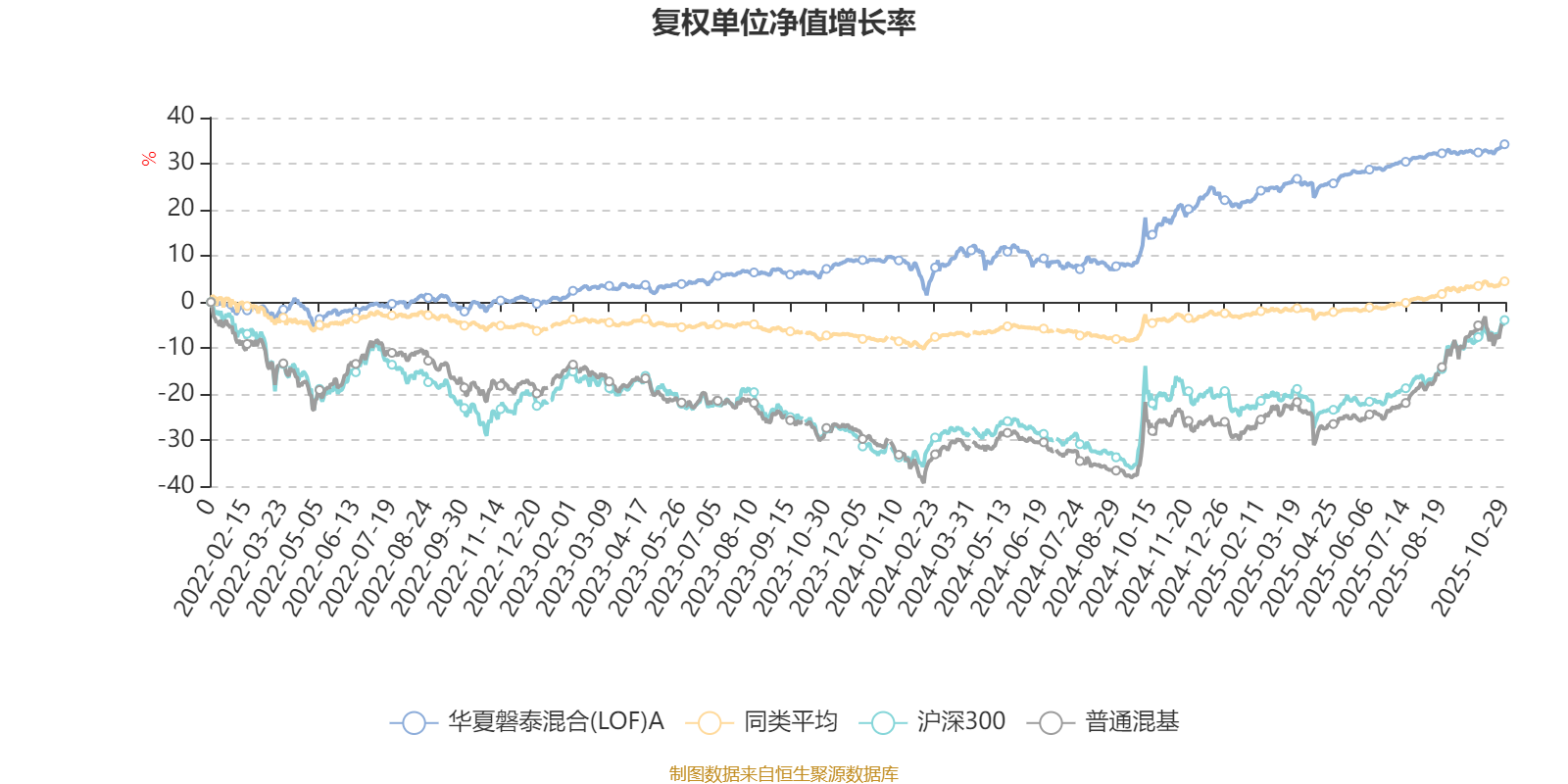 截至10月29日,华夏磐泰混合(LOF)A近三个月复权单位净值增长率为2.16%,位于同类可比基金369/629;近半年复权单位净值增长率为6.63%,位于同类可比基金241/629;近一年复权单位净值增长率为14.18%,位于同类可比基金65/623;近三年复权单位净值增长率为36.97%,位于同类可比基金11/557。