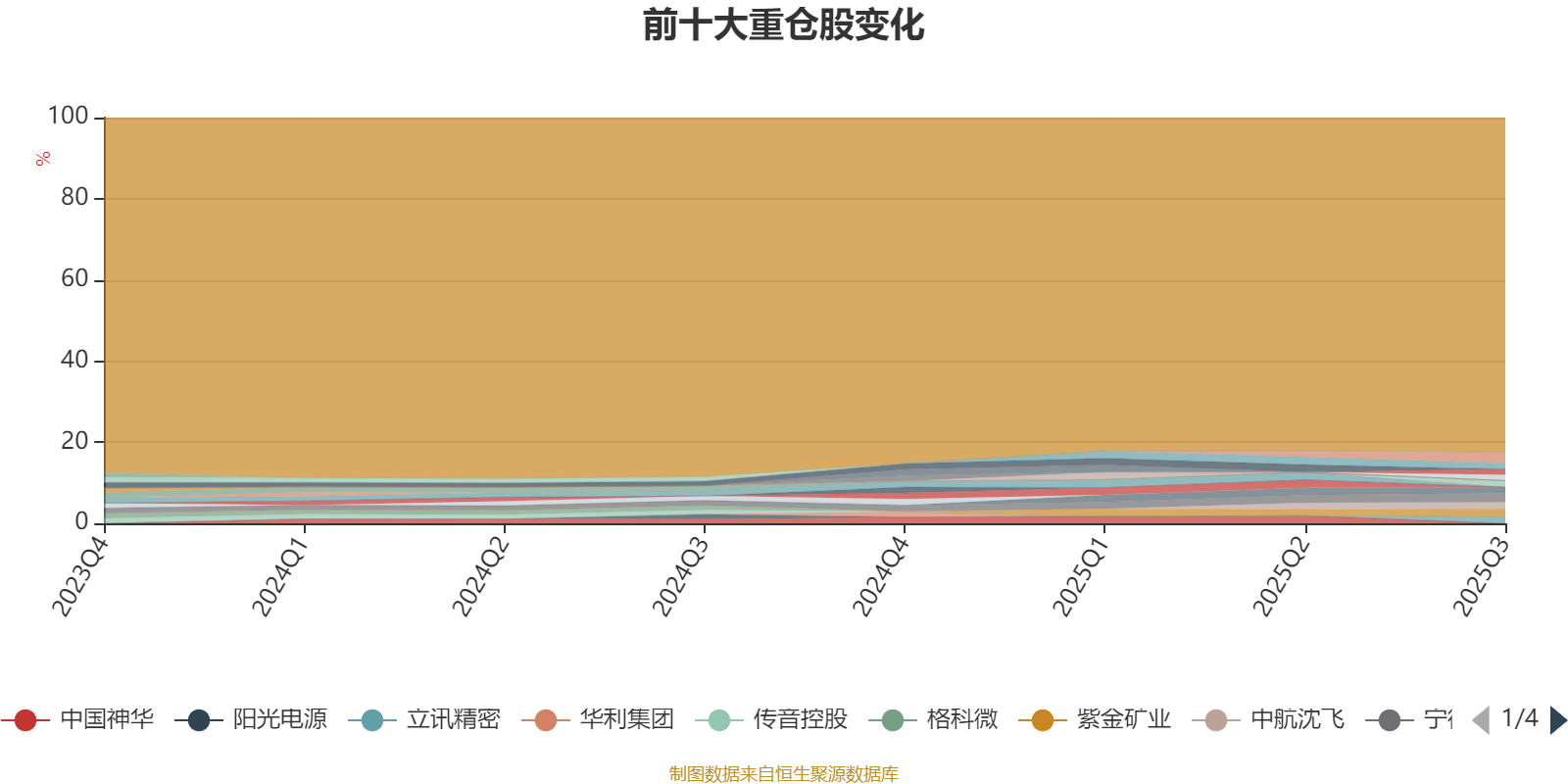截至2025年三季度末,基金十大重仓股分别是工业富联、宁德时代、紫金矿业、中航沈飞、立讯精密、宝钢股份、小商品城、恒瑞医药、中国电信、牧原股份。