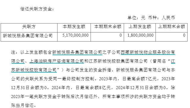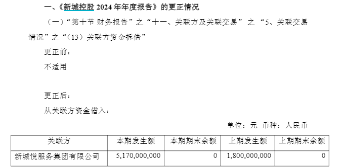 新城控股所说的“错误”,涉及新城控股2024年年报的关联资金拆借部分。更正前,该部分内容被勾选为“不适用”,即没有发生;更正后的内容显示,新城控股与“新城系”物企新城悦服务,在2023年、2024年分别发生18亿元、51.7亿元资金拆借。