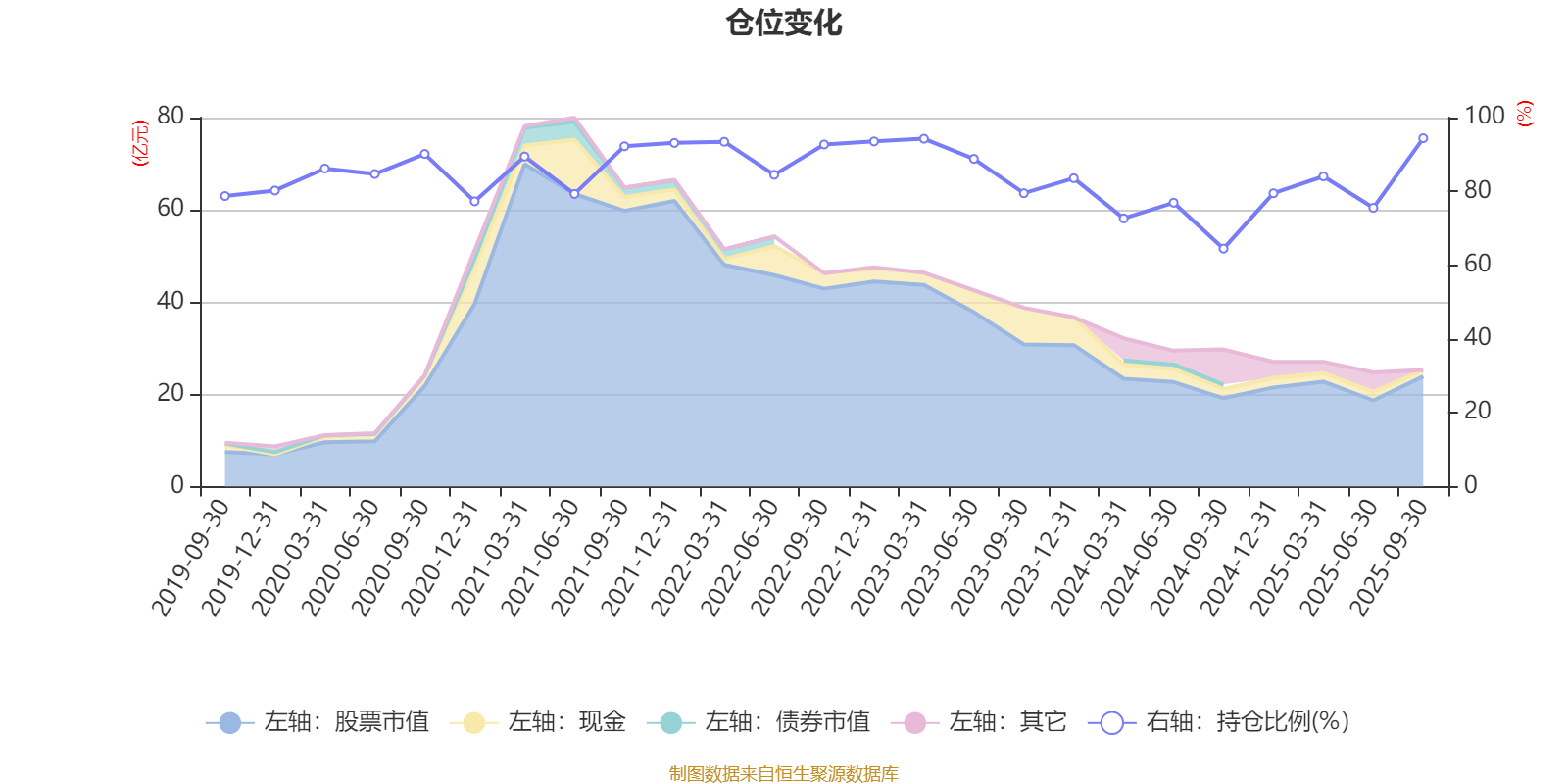 据定期报告数据统计,近三年平均股票仓位为82.28%,同类平均为87.62%。2025年三季度末基金达到94.41%的最高仓位,2024年三季度末最低,为64.49%。