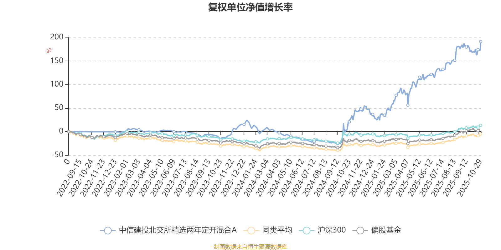 截至10月29日,中信建投北交所精选两年定开混合A近三个月复权单位净值增长率为17.95%,位于同类可比基金240/621;近半年复权单位净值增长率为47.40%,位于同类可比基金107/621;近一年复权单位净值增长率为119.06%,位于同类可比基金1/611;近三年复权单位净值增长率为192.66%,位于同类可比基金1/518。