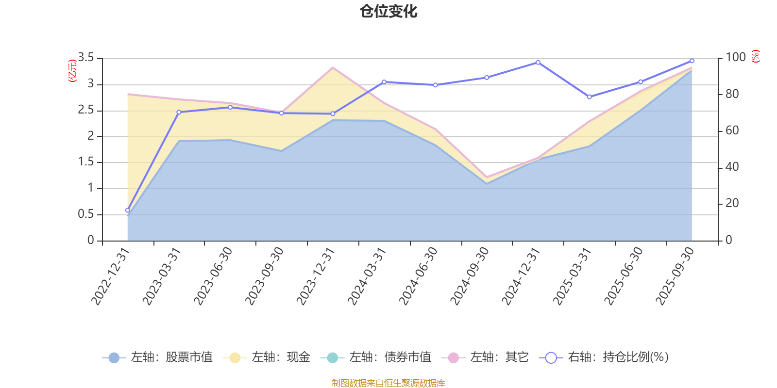 据定期报告数据统计,近三年平均股票仓位为76.97%,同类平均为85.66%。2025年三季度末基金达到98.57%的最高仓位,2022年末最低,为16.72%。