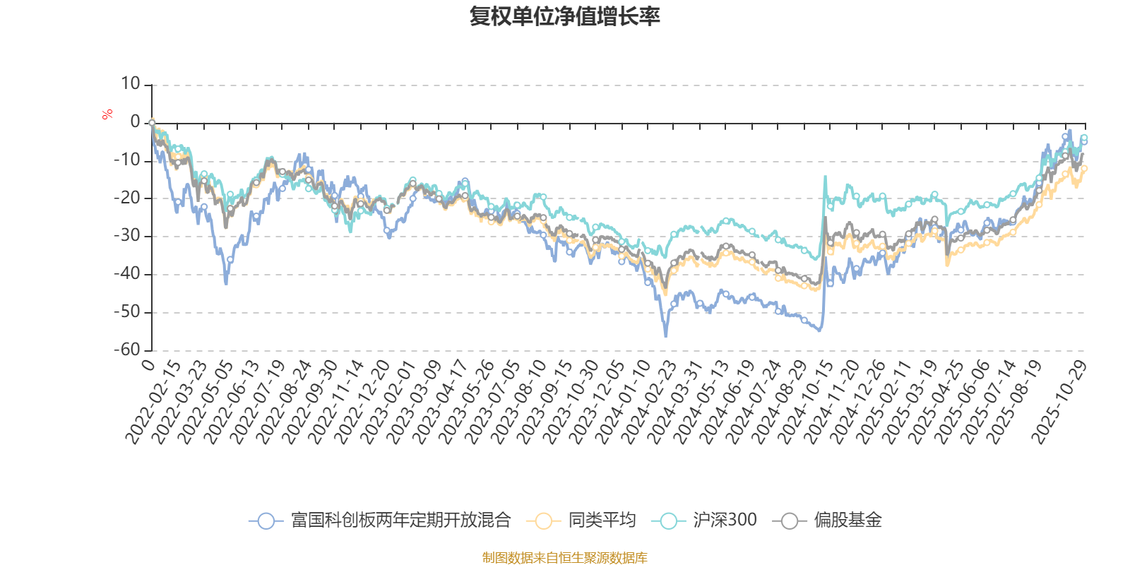 截至10月29日,富国科创板两年定期开放混合近三个月复权单位净值增长率为17.56%,位于同类可比基金64/185;近半年复权单位净值增长率为31.30%,位于同类可比基金85/185;近一年复权单位净值增长率为59.76%,位于同类可比基金16/181;近三年复权单位净值增长率为14.45%,位于同类可比基金118/175。