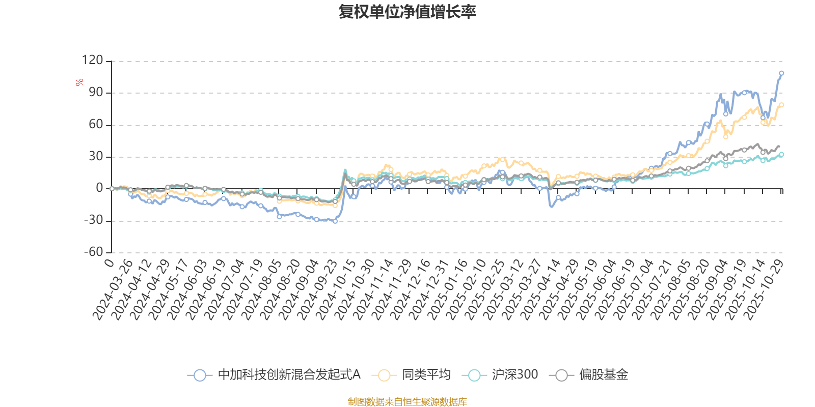 截至10月29日,中加科技创新混合发起式A近三个月复权单位净值增长率为44.61%,位于同类可比基金60/229;近半年复权单位净值增长率为118.86%,位于同类可比基金17/229;近一年复权单位净值增长率为103.75%,位于同类可比基金22/213。