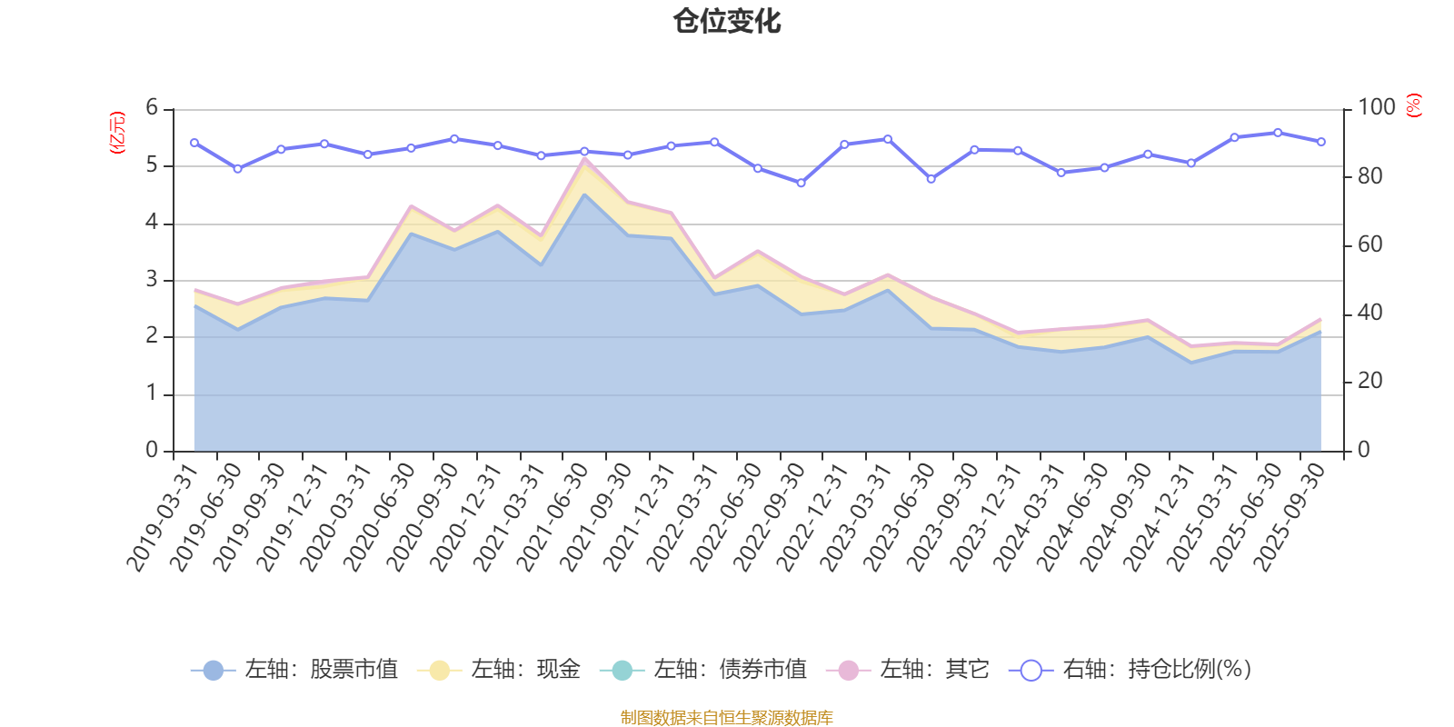据定期报告数据统计,近三年平均股票仓位为87.25%,同类平均为72.35%。2025年上半年末基金达到93.12%的最高仓位,2022年三季度末最低,为78.42%。