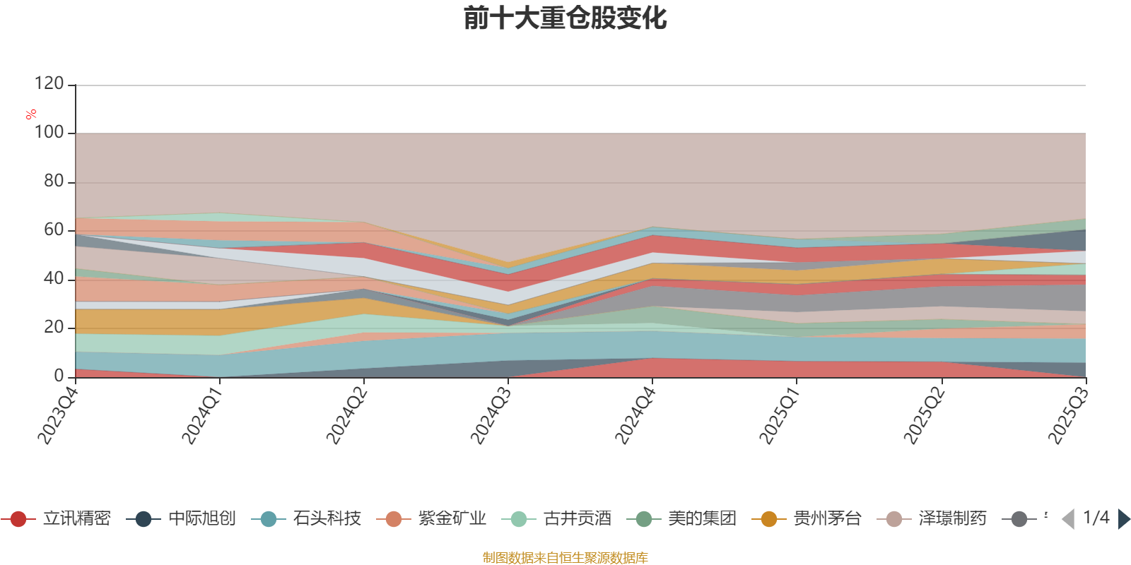 截至2025年三季度末,基金十大重仓股分别是宁德时代、石头科技、新易盛、中际旭创、紫金矿业、泽璟制药、金诚信、思特威、纽威股份、艾力斯。