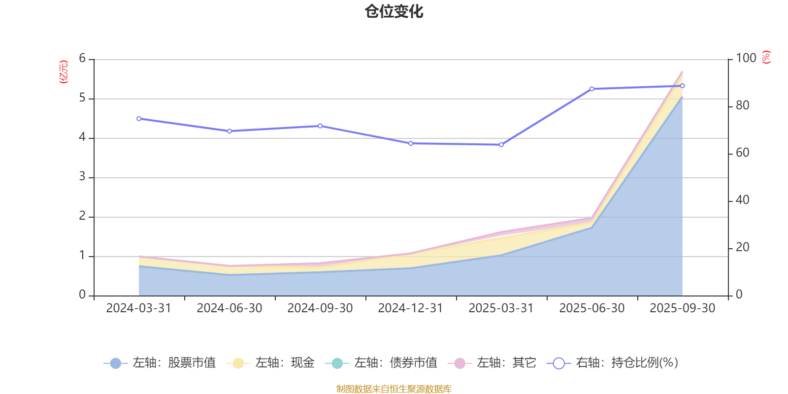 据定期报告数据统计,成立以来平均股票仓位为74.34%,同类平均为85.66%。2025年三季度末基金达到88.72%的最高仓位,2025年一季度末最低,为63.79%。