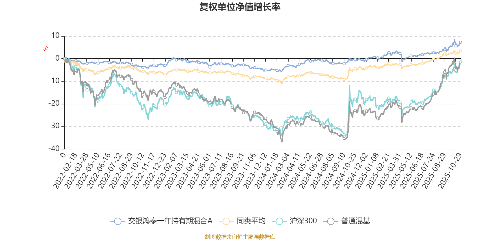 截至10月29日,交银鸿泰一年持有期混合A近三个月复权单位净值增长率为4.46%,位于同类可比基金149/629;近半年复权单位净值增长率为6.58%,位于同类可比基金246/629;近一年复权单位净值增长率为7.78%,位于同类可比基金281/623;近三年复权单位净值增长率为11.96%,位于同类可比基金277/557。