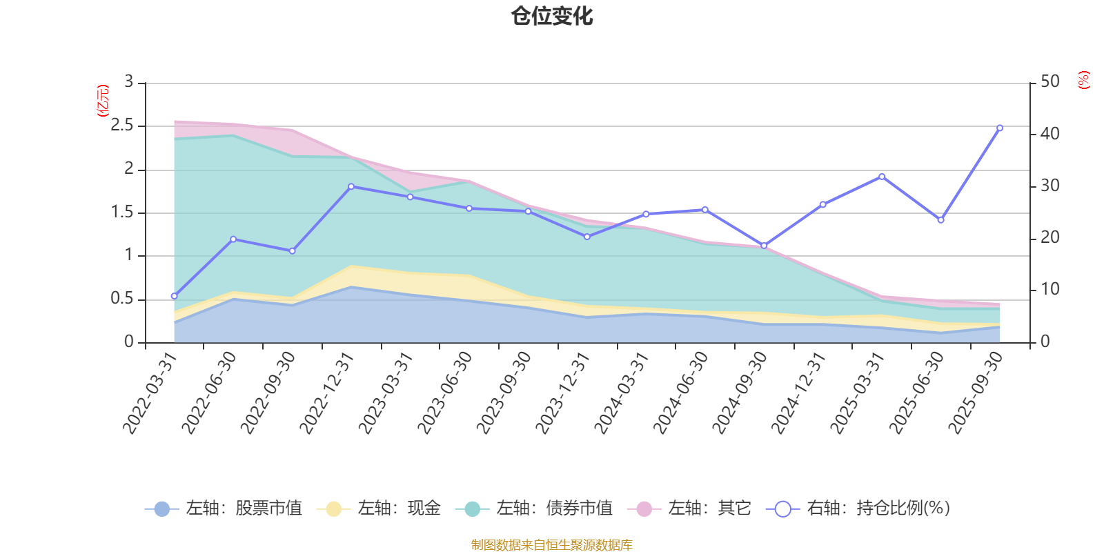 据定期报告数据统计,近三年平均股票仓位为26.83%,同类平均为19.14%。2025年三季度末基金达到41.31%的最高仓位,2022年一季度末最低,为8.96%。