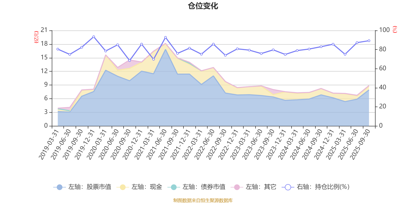 据定期报告数据统计,近三年平均股票仓位为80.85%,同类平均为85.99%。2019年末基金达到93.43%的最高仓位,2020年三季度末最低,为68.47%。
