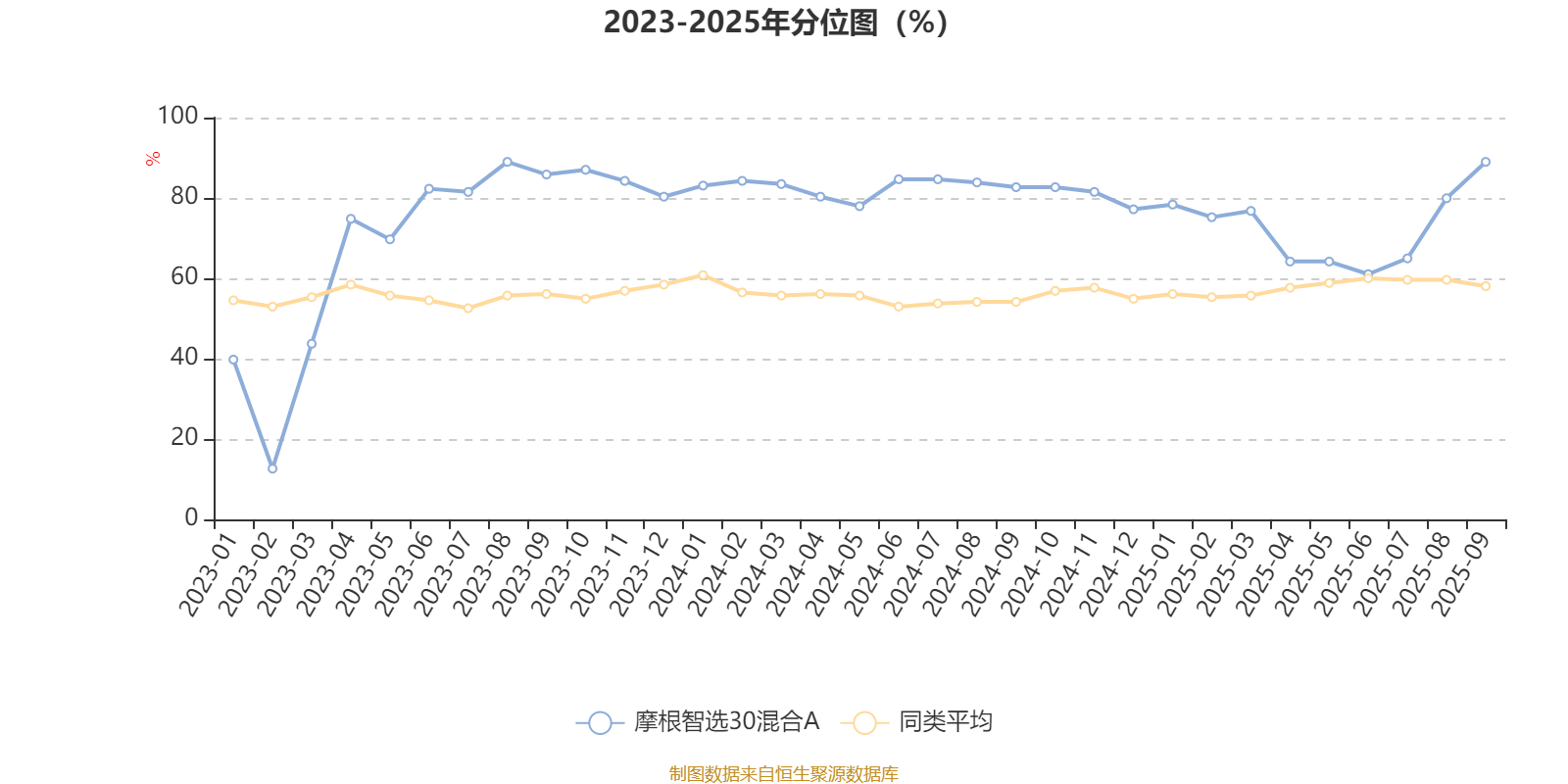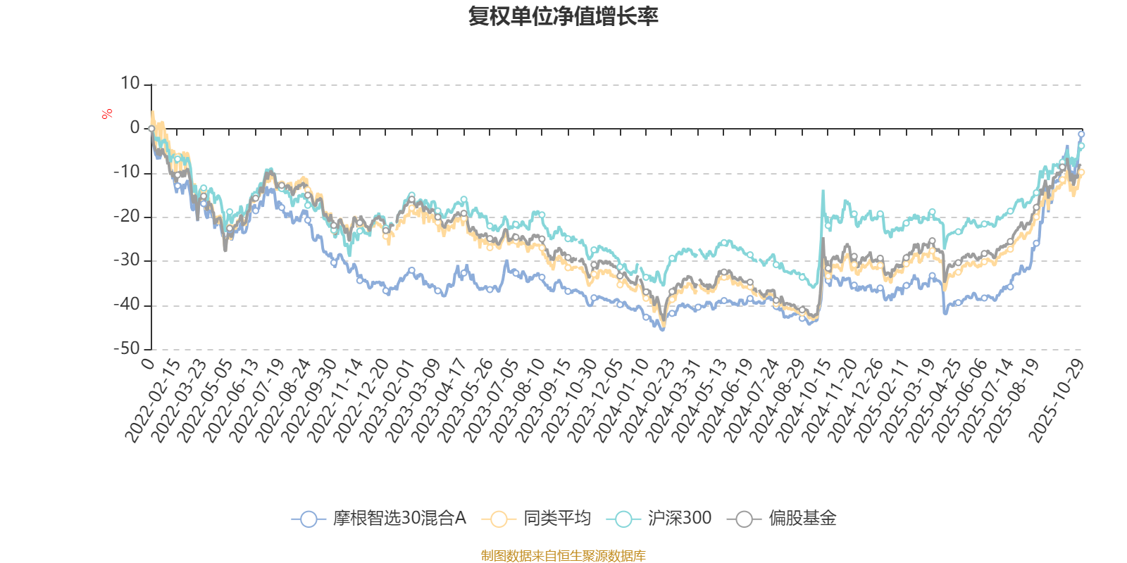 截至10月29日,摩根智选30混合A近三个月复权单位净值增长率为42.95%,位于同类可比基金8/265;近半年复权单位净值增长率为63.29%,位于同类可比基金22/265;近一年复权单位净值增长率为50.62%,位于同类可比基金45/265;近三年复权单位净值增长率为46.35%,位于同类可比基金41/253。