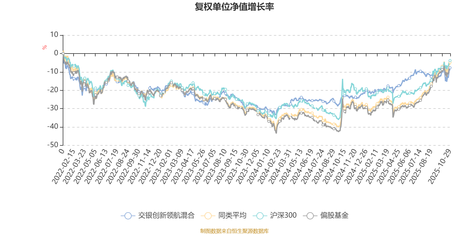 截至10月29日,交银创新领航混合近三个月复权单位净值增长率为4.56%,位于同类可比基金112/130;近半年复权单位净值增长率为11.03%,位于同类可比基金118/130;近一年复权单位净值增长率为20.52%,位于同类可比基金90/130;近三年复权单位净值增长率为19.83%,位于同类可比基金78/124。