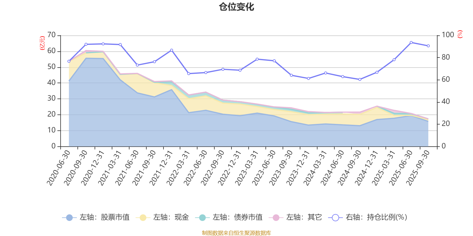据定期报告数据统计,近三年平均股票仓位为72.36%,同类平均为86.15%。2025年上半年末基金达到93.61%的最高仓位,2024年三季度末最低,为60.38%。