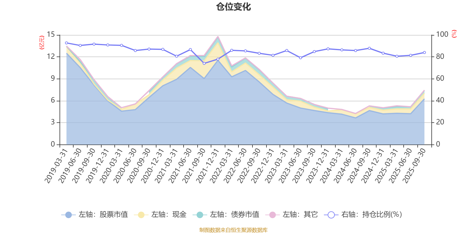 据定期报告数据统计,近三年平均股票仓位为84%,同类平均为85.99%。2019年一季度末基金达到92.73%的最高仓位,2021年三季度末最低,为74.09%。