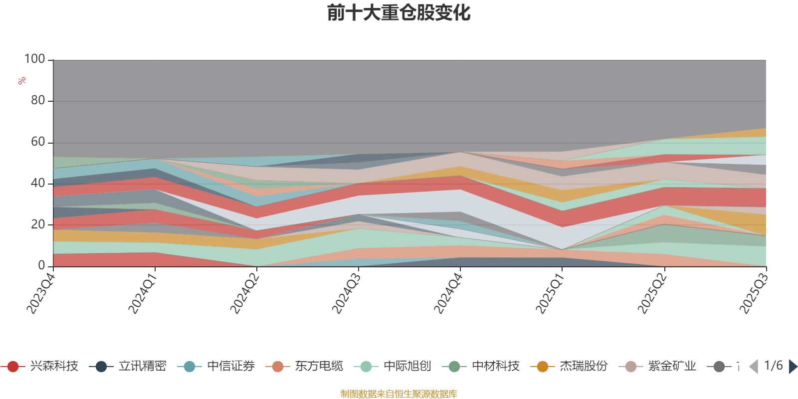 该基金持股集中度较高。截至2025年三季度末,基金十大重仓股分别是寒武纪、中际旭创、恺英网络、新易盛、中天科技、中材科技、亿纬锂能、胜宏科技、浪潮信息、通富微电。